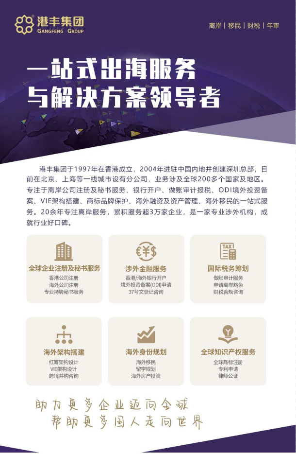 今年是港丰集团成立20周年,港丰集团以“一站式出海服务与解决方案领导者”的形象,焕新出发,将秉承“助力更多企业迈向全球,帮助更多国人走向世界!”的使命,助力企业出海,提高企业的国际竞争力。